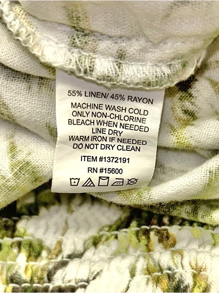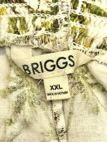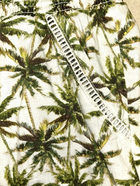 Briggs brand linen blend shorts, size XXL, with all-over palm tree design. These feature elastic pull string waist with front tassels; 2 front slash pockets with trim detail; 2 back pockets; and a 4.5 inch inseam. They are in overall very good condition from smoke free home with no known flaws. The fabric is off-white with a mixture of browns and greens. $8
