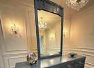 Stunning refinished triple dresser in a sophisticated blue-gray finish with beautiful gold trim and shiny gold hardware! 9 spacious drawers decorated with high-strength adhesive vinyl paper featuring dark floral motifs.+ bonus FREE huge matching mirror that makes the room look bigger and brighter. Perfect for a luxurious bedroom! Solid wood, professionally painted and sealed for a smooth, high-end look. The gold details give it that expensive custom furniture vibe.