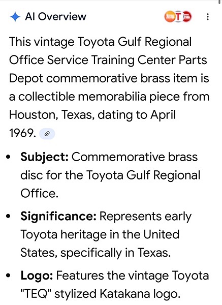 This vintage Toyota Gulf Regional Office Service Training Center Parts Depot commemorative brass magnifying glass is a collectible memorabilia piece from Houston, Texas, dating to April 1969.