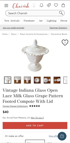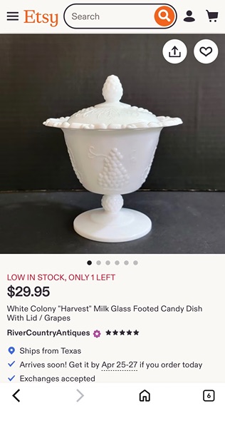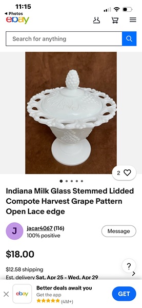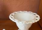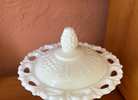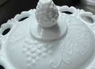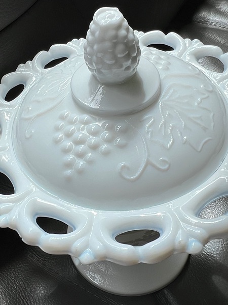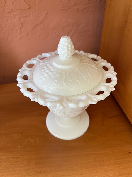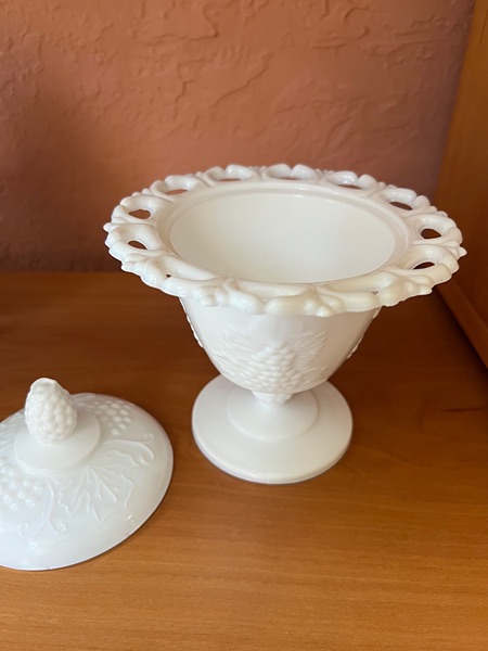 This is a Vtg. Indiana Glass Open Lace Milk Glass Grape Pattern Footed Compote with Lid. It measures 6 3/4" high with the lid and 5 3/4" in diameter. The piece is in good overall condition with minor signs of wear consistent with its age and use. Dimensions 5.75"W × 5.75"D × 6.75"H...$15 firm