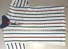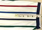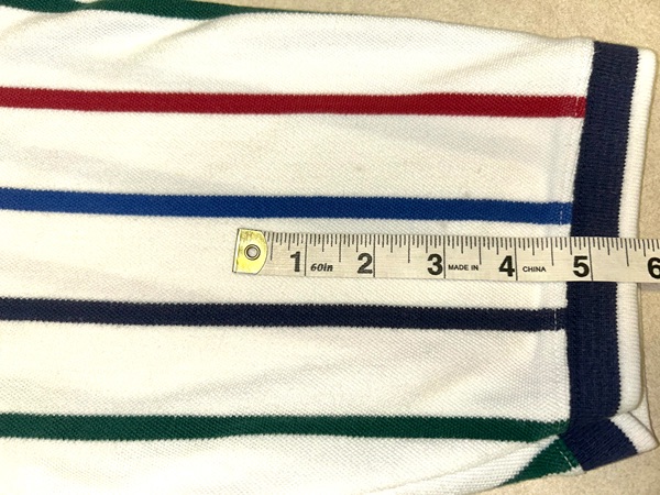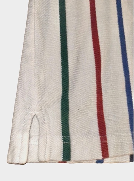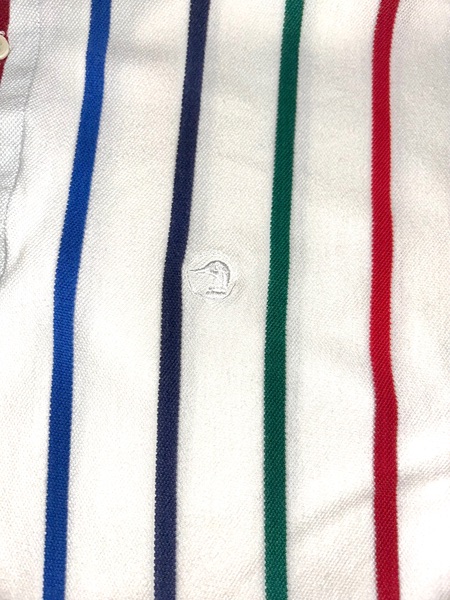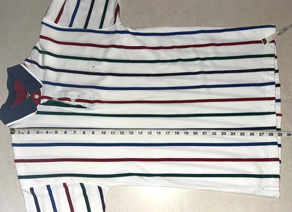 Vintage late ‘90s short sleeve men’s Duck Head polo, 100% cotton, size medium. Features 3-button placket trimmed in green, rib-cuffed sleeves and collar trimmed in blue, embroidered logo on left chest, and split hems. Shirt has minor wear/fading, which is most evident on the blue collar trim. There are a few tiny spots on the back of one sleeve (pictured above the measuring tape on the sleeve). Shirt is in overall very good condition, especially considering its age. Smoke free home. $15