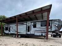 - Exterior: Power awning, outdoor speakers, pass‑through storage, outdoor shower – hot and cold water,