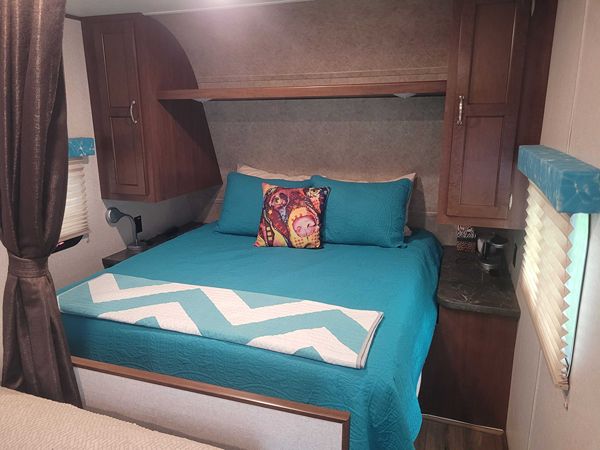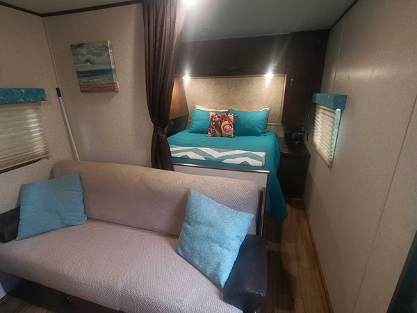 After Market Upgrades: Electric tongue jack with light, propane tank cover, aluminum wheels, new Carlisle tires, wheel bearings recently repacked, rear bumper heavy duty supports, rear bumper bike rack hitch, new home-quality vinyl flooring, dinette booth upgraded with marine quality vinyl upholstery, new window valance covers, queen bed luxury 4 inch memory foam topper.