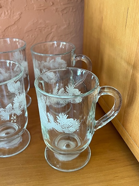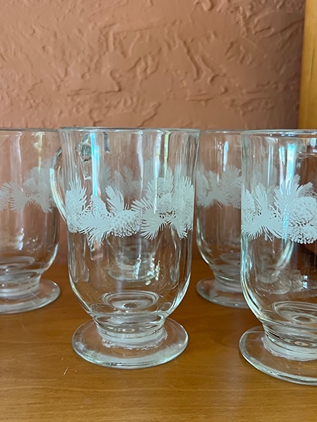 These are vintage Libbey footed Irish coffee mugs featuring an etched pine cone design. Woodlands theme!