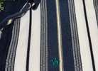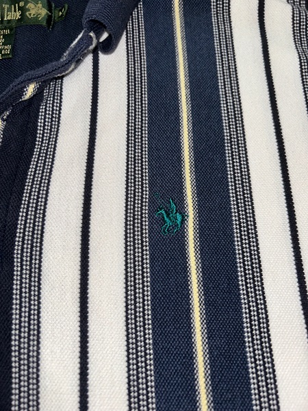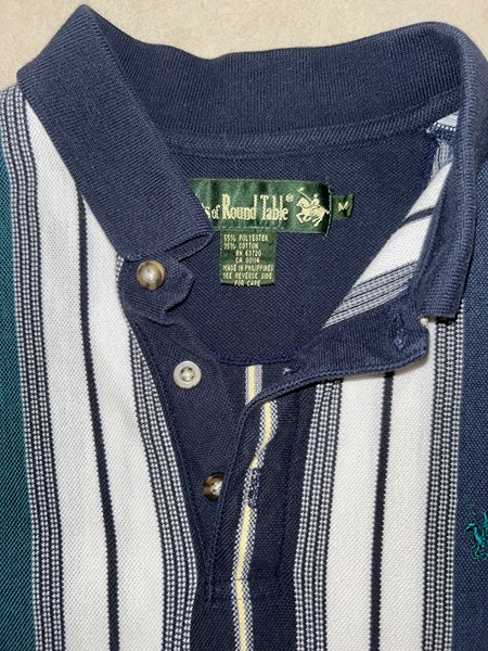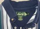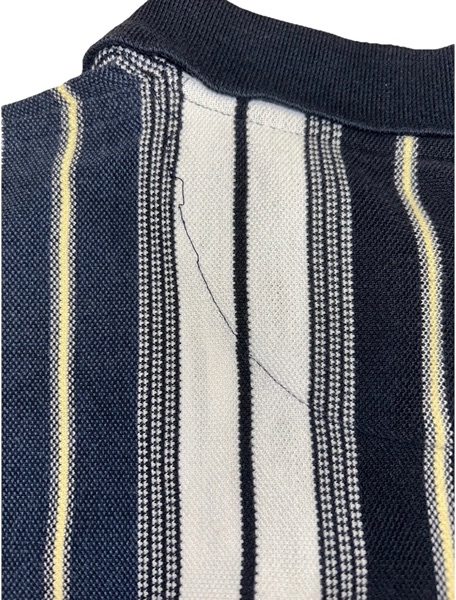 Vintage men’s medium vertical multicolor (green, blues, yellow) striped short sleeve polo from mid-late 90s/Y2K. Has 3 button placket; navy trim on collar, placket, and sleeves; green embroidered logo on left chest; ribbed collar and sleeve cuffs; and split hems. No known major flaws, but the thread in the semicircle trim on the upper back is a little loose in one spot (pictured) and there’s light fading/wear. Overall, still in very good condition, especially considering age, from smoke free home. $10
