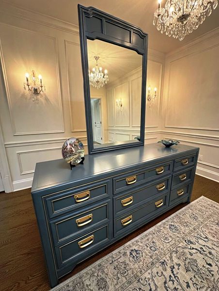 Stunning refinished triple dresser in a sophisticated blue-gray finish with beautiful gold trim and shiny gold hardware! 9 spacious drawers decorated with high-strength adhesive vinyl paper featuring dark floral motifs.+ bonus FREE huge matching mirror that makes the room look bigger and brighter. Perfect for a luxurious bedroom! Solid wood, professionally painted and sealed for a smooth, high-end look. The gold details give it that expensive custom furniture vibe. The drawers decorated with lenify dark floral wallpaper (contact paper) high quality resistance. Measurements: Height 38”, Length 66” Depth 18”. Pro Tip: This finish is "living" for the first 30 days. Please avoid heavy use or placing sharp objects on the surface until it is fully cured.