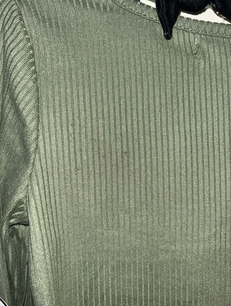 This outfit contains an olive rib knit long sleeve tie-front top with a sparkly, sequin unicorn; black floral print leggings; and bonus matching floral tie headband. Girls size 4T. The material is super soft. It's new with tags, but the pants hanger rubbed against the back of the shirt, creating small snags on the shoulder blade areas (pictured). $8