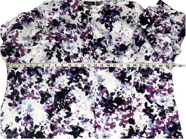 Plus size multicolor floral top featuring 3/4 sleeves, princess seams, double button cuffs, and stretch fabric (3% spandex). Soft fabric, no known flaws, very good condition from smoke free home. $8