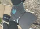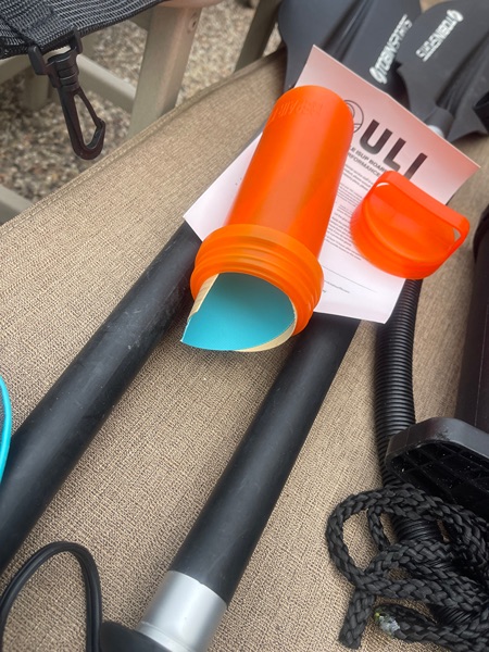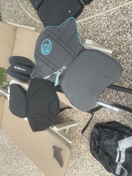All Must go together. This is all unused except it's been sitting on our back porch so it's dirty just needs a rinse. All random pieces to equipment we've bought and never used. Includes couple paddles, one electric Uli pump, one regular pump, patch repair kit, mesh carry pouch, one inflatable carry bag, one SUP bag on wheels, numerous seat and other accessories and 2 replacement fins. Panther Creek 77381