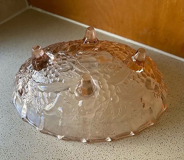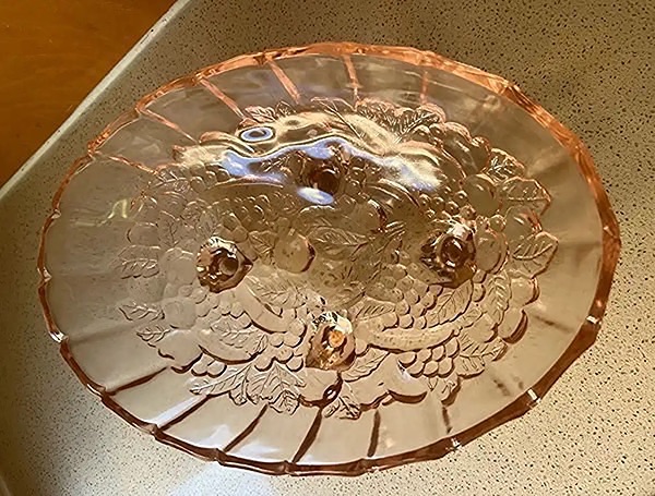 • The color is a peach-pink hue, typical of depression-era glass.