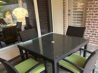 Four Outdoor Wrought Iron Chairs + Side Table + Cushions