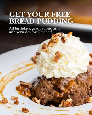 Celebrate your special day with us! We're offering FREE bread pudding for all birthdays, graduations, and anniversaries this October. Every celebration deserves a sweet ending!