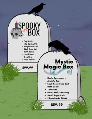 The Spooky Spa Box includes a dry brush, Isla Bonita oil, magnesium oil, a skull rose salt bath bomb, lucid soap, a gua sha, and a face serum. The price for this box is $99.99.