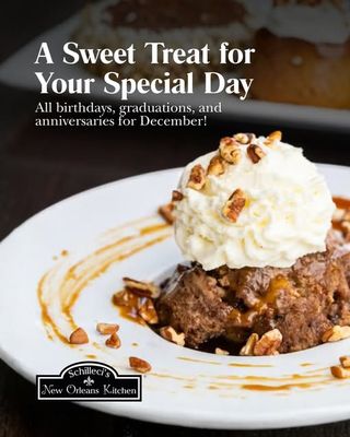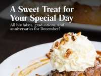 Celebrate your special day with us this December! Free bread pudding for birthdays, graduations, and anniversaries. Every celebration deserves a sweet ending.