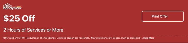 Offer valid only at Mr. Handyman of The Woodlands. Limit one coupon per household. New customers only. Coupon must be presented at time of service. No cash value. Not valid with any other offer and cannot be combined with other offers. Service performed by locally owned and independently operated franchise business. Other restrictions may apply.