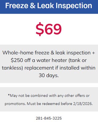 Whole-home freeze & leak inspection + $250 off a water heater (tank or tankless) replacement if installed within 30 days.