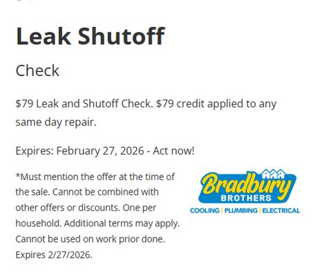 $79 Leak and Shutoff Check. $79 credit applied to any same day repair.
