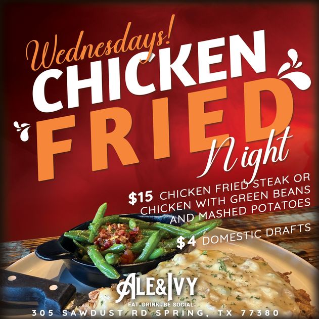 Join Ale & Ivy every Wednesday for a mouthwatering midweek special. Enjoy a hearty plate of Chicken Fried Steak or Chicken, served with green beans and mashed potatoes for just $15. Pair your meal with $4 domestic drafts and make it a weekly tradition.