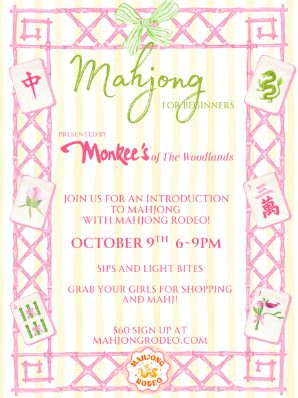 I’ll be teaching a beginner Mahjong 101 lesson at Monkee’s of The Woodlands! This store is absolutely stunning, I can’t wait to spend the evening here with you!