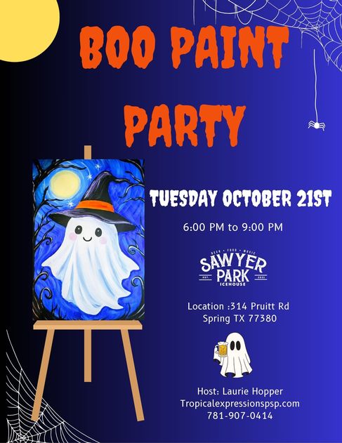 Looking for a fun Halloween event near The Woodlands and Spring, TX? Join Tropical Expressions Paint Parties for the Boo Paint Party at Sawyer Park Icehouse on Tuesday, October 21, 2025, from 6-9 PM.