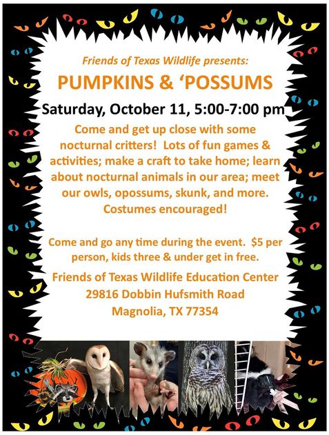 Looking for a fun family event in Magnolia this October? Join Friends of Texas Wildlife for our Critter Classroom: Pumpkins & ’Possums on Saturday, October 11, 2025, from 5:00-7:00 PM at our Education Center, 29816 Dobbin Hufsmith Road, Magnolia, TX.