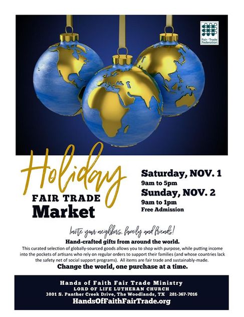 Lord of Life Lutheran Church's global fair trade mission, the Hands of Faith Fair Trade Store, has their annual holiday market November 1st (9-5) & 2nd (9-1). This is a wonderful shopping opportunity that is free to attend! HOF is the ONLY Fair Trade Federation certified fair trade store in the greater Houston area, so you can feel confident that the dollars you spend go directly to the artisans who created the pieces at a fair wage with safe working conditions. Toys, decorative items, clothing, jewelry, kitchen goods, Christmas decor, linens, food, stationary, and more!! Every dollar you spend this holiday season casts a vote on what kind of world you want to live in.