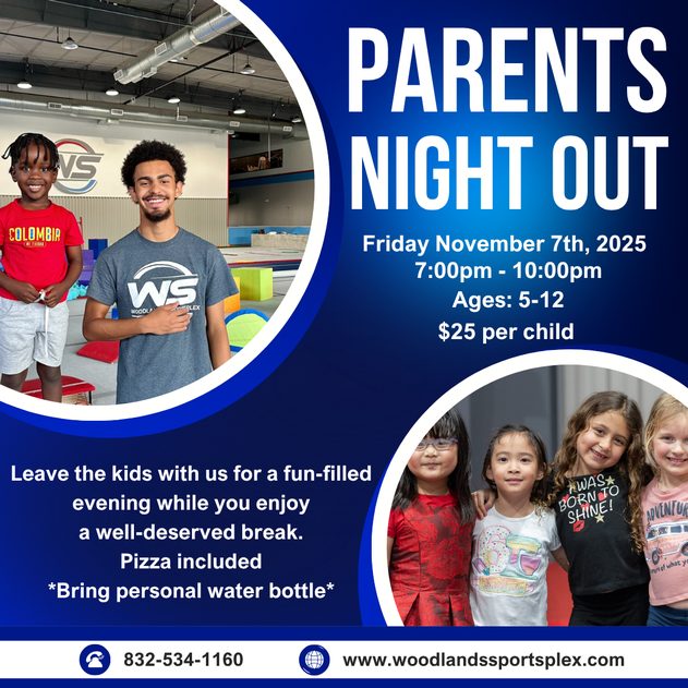 Parents Night Out 11/7/25 7:00pm-10:00pm Ages 5 - 12 Pizza & Water Served Drop the kids off with us for a fun filled night!