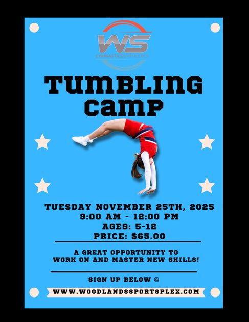 Tumbling Camp November 25th, 2025 9am - 12:00pm $65.00 per child Great opportunity to work on and master a new skill! Ages 5-12