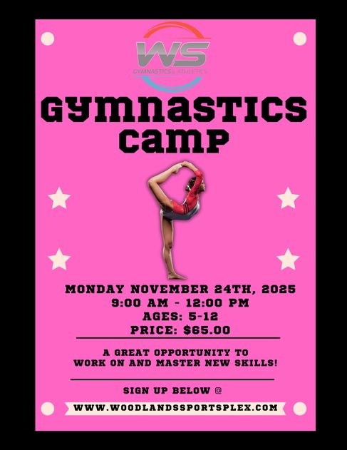 Gymnastics Camp Monday November 24th, 2025 9:00am - 12:00pm $65.00 per child Great opportunity to work on and master a new skill! Ages 5-12