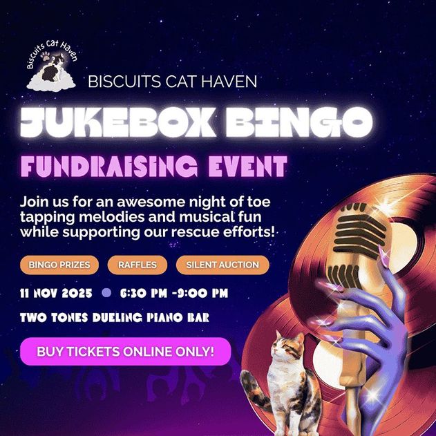 A fundraising event benefitting 501(c)(3) nonprofit cat rescue Biscuits Cat Haven, have fun singing along to six rounds of bingo and check out our awesome raffle prizes, silent auction items, and staff-designed merchandise!