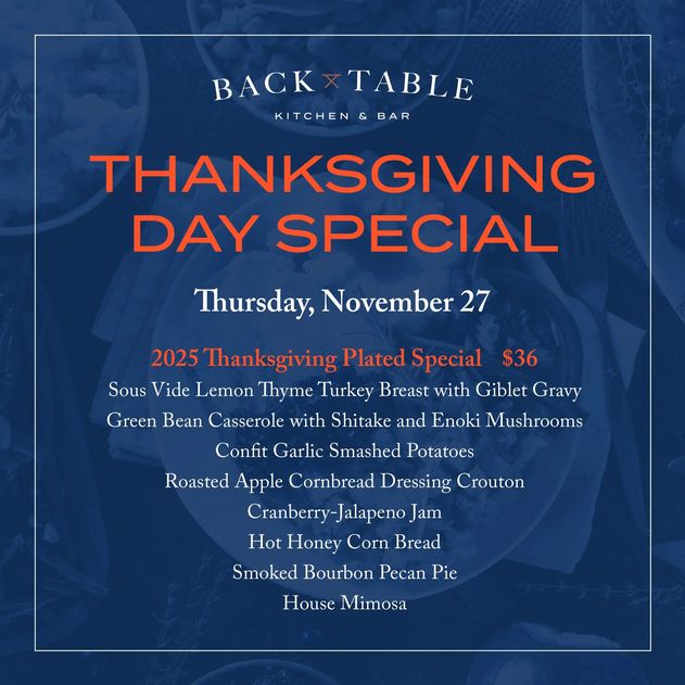 Celebrate Thanksgiving with an elegant twist on classic holiday favorites. The Thanksgiving Plated Special features Sous Vide Lemon Thyme Turkey Breast with Giblet Gravy, served alongside Green Bean Casserole with Shiitake and Enoki Mushrooms, Confit Garlic Smashed Potatoes, and Roasted Apple Cornbread Dressing Crouton. A touch of Cranberry-Jalapeño Jam and Hot Honey Cornbread add modern warmth, while Smoked Bourbon Pecan Pie and a House Mimosa complete this refined holiday feast.