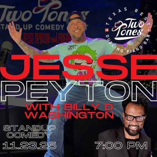 Get ready for a night of nonstop laughter at Two Tones Dueling Piano Bar in The Woodlands on November 23! 🤣 The stage transforms into a full-blown comedy club featuring headliner Jesse Peyton and special guest Billy D. Washington. Gather your friends and enjoy an evening packed with hilarious punchlines, great drinks, and unforgettable fun at one of The Woodlands’ top live entertainment venues.