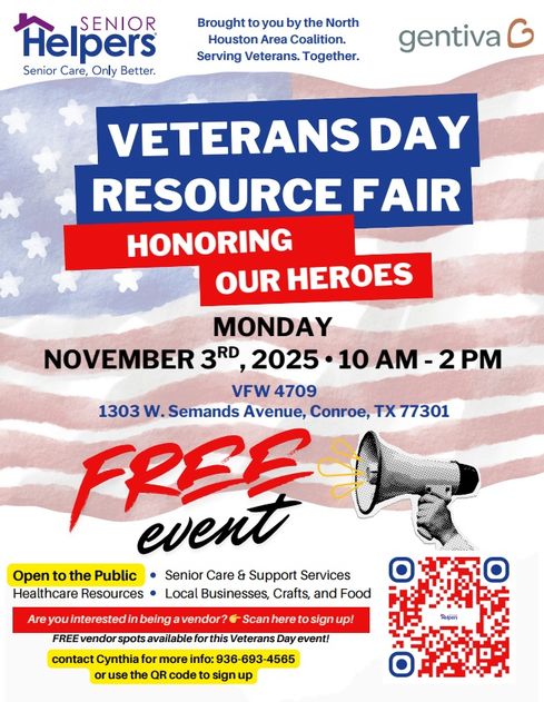 The North Houston Area Coalition proudly presents the Veterans Day Resources Fair, a special community event dedicated to honoring our heroes. The fair will take place on Monday, November 3, 2025, from 10:00 AM to 2:00 PM at VFW Post 4709, located in Conroe, Texas.