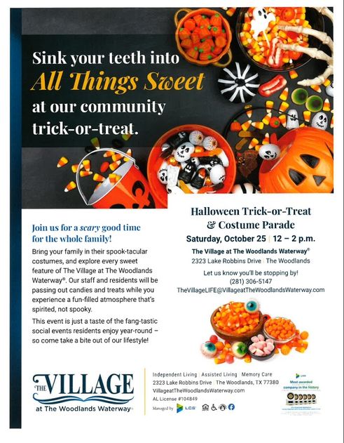 Bring your family in their spook-tacular costumes, and explore every sweet feature of The Village at The Woodlands Waterway®. Our staff and residents will be passing out candies and treats while you experience a fun-filled atmosphere that's spirited, not spooky.