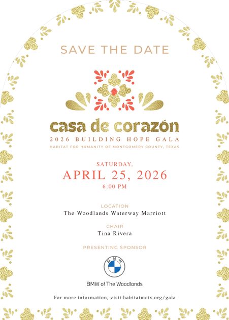 Habitat for Humanity of Montgomery County, TX is excited to host the 2026 Building Hope Gala, Casa de Corazón, on Saturday, April 25, 2026, from 6 p.m. to 11 p.m. at The Woodlands Waterway Marriott.