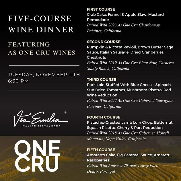 Indulge in an unforgettable evening at our Exclusive Five-Course Wine Dinner, crafted in collaboration with Jaime Ramirez of @asonecru! Savor a handpicked selection of premium California wines, expertly paired with gourmet dishes, all while enjoying live music that sets the perfect ambiance.