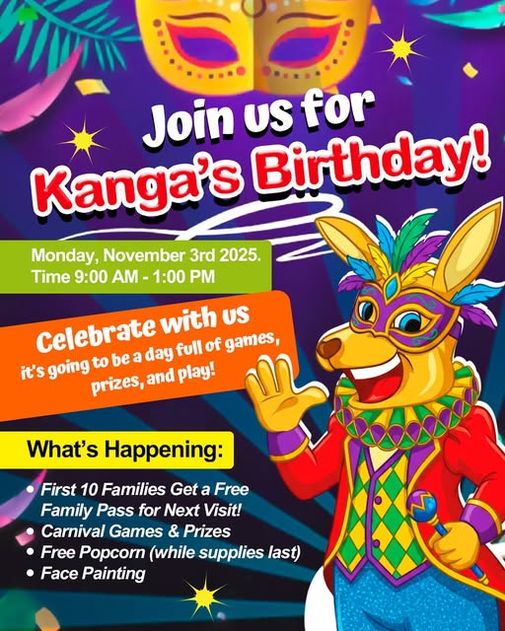 Celebrate Kanga’s special day with a morning full of fun, laughter, and excitement! Bring the whole family for games, prizes, and plenty of play.
