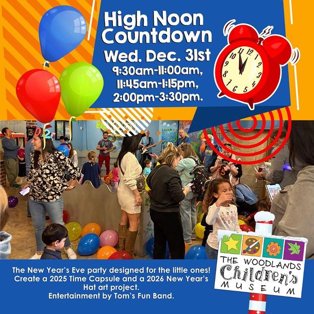 Create festive New Year’s hats and a time capsule to capture memories to share in the future. Get ready to pop and bop in our bubble wrap dance room and enjoy Tom’s Fun Band who will be rocking the house with their upbeat tunes, making this a New Year’s Eve one to remember. Enjoy a delicious New Year’s punch upon exiting. #ToddlerMom #Art #ChildrensMuseum #TheWoodlands #WoodlandsMom #TheWoodlandsChildrensMuseum #HolidaySeason2025