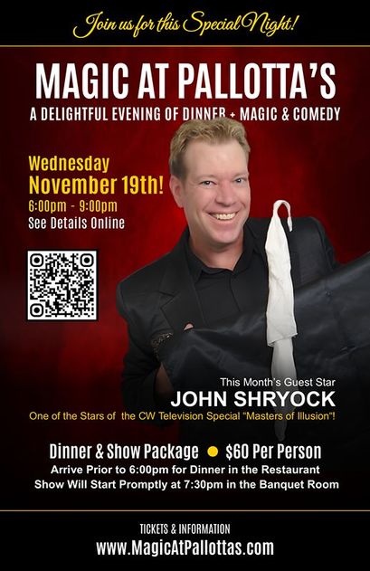 Join us on November 19th for a special evening of magic at Pallotta’s Italian Grill in The Woodlands for a great Italian dinner followed by a performance by “Master Magician” John Shryock!