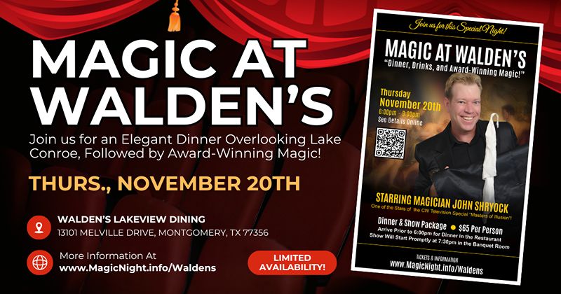 Join us on November 20th for a special evening of magic at Walden’s Lakeview Dining overlooking Lake Conroe for a great dinner followed by a performance by “Master Magician” John Shryock!