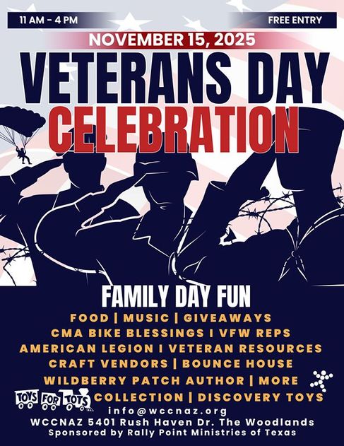 Woodlands Community Church and Rally Point Ministries of Texas is holding a special event for veterans and their families on Nov. 15. This is a free event featuring inflatables and games for kids, free food (hotdogs, popcorn, snow cones, and cotton candy), craft vendors, a bike blessings, services for veterans, music, door prizes, food truck, and more. Everyone is welcome to come and celebrate the brave men men and women who have given themselves in service for our freedom.