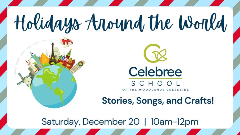 Join us and our friends at Celebree School of The Woodlands to learn about winter holidays celebrated around the world. Grab your passport and visit five different locales: Africa, India, Israel, Mexico, and the United States. During your stay, listen to a short story from that location and do a simple craft.