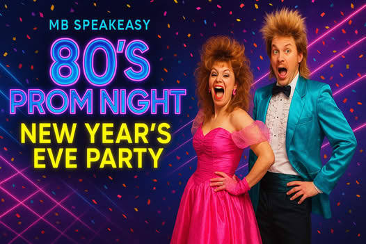 Get ready to travel back in time! This New Year’s Eve, MB Speakeasy is hosting the most epic 80’s Prom Night Party — packed with retro fashion, neon lights, iconic music, and unforgettable nostalgia. If you're searching for the best NYE party in The Woodlands, this is THE place to be!