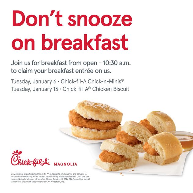 Join us January 13th for a FREE breakfast giveaway at Chick-fil-A Magnolia!