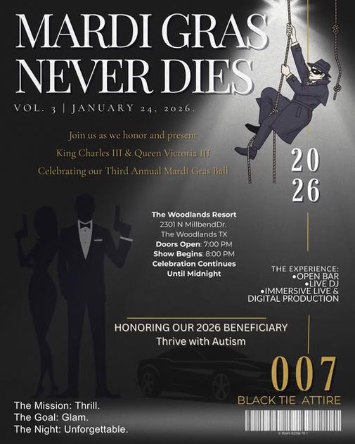 Guests will be transported into the world of James Bond with a 007-themed program and state-of-the-art production. The evening will feature the sounds of DJ Supa Dave from Lafayette, Louisiana, along with an open bar and silent auction. Guests will also enjoy the presentation of the 2026 Mardi Gras Royal Court and the crowning of the 2026 King and Queen — a celebration of Mardi Gras spirit and tradition with a KREWE de HOU twist, combining elegance, excitement, and community impact in true Louisiana style.