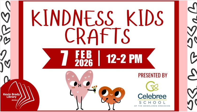 Join us for a creative crafting session at the library, hosted in partnership with Celebree School of The Woodlands! Designed for ages 0–6 but open to all ages, this cozy afternoon of fun is the perfect way to embrace the Valentine's season. Enjoy kindness and friendship-themed crafts in our Programming Room from 12-2PM! Bring the whole family and make warm memories on a chilly day.
