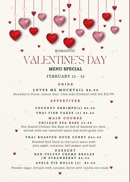 Whether you’re planning an intimate dinner for two or celebrating love with friends, Charm Thai Kitchen & Bar offers the perfect Valentine’s Day dining experience with authentic Thai cuisine, handcrafted drinks, and an inviting atmosphere. Reservations are highly recommended for this special holiday event.