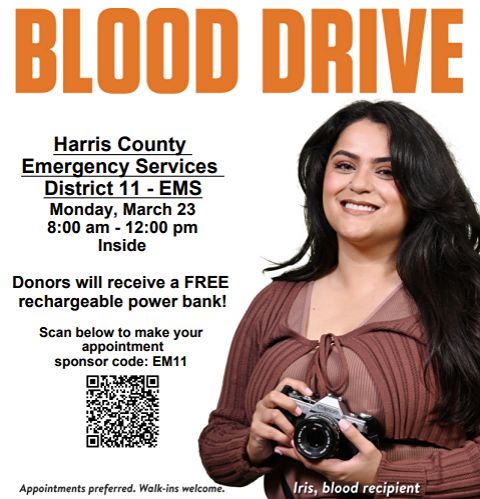 Harris County ESD 11 will begin providing life-saving plasma to patients experiencing significant blood loss before they get to the hospital. Help us save lives by donating blood at our blood drive! Bring your ID to donate and get a FREE rechargeable power bank.