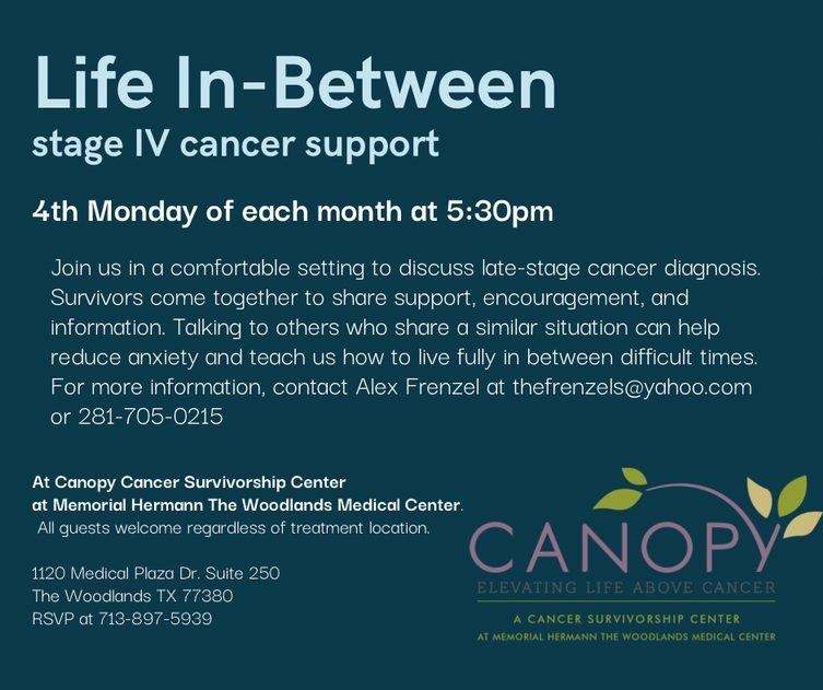 Join us in a comfortable setting to discuss late-stage cancer diagnosis. Survivors come together to share support, encouragement, and information. Talking to others who share a similar situation can help reduce anxiety and teach us how to live fully in between difficult times. For more information, contact Aex Frenzel at the thefrenzels@yahoo.com or 281-705-0215