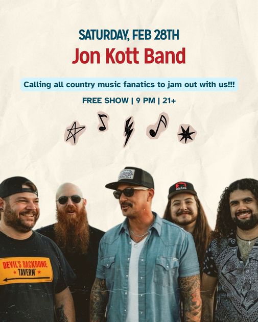 Get ready for a night of high-energy country music as the Jon Kott Band takes the stage at Sawyer Park Icehouse on Saturday, February 28 at 9PM! Calling all country music fanatics - grab your boots, round up your friends, and come jam out to a great night of live music.